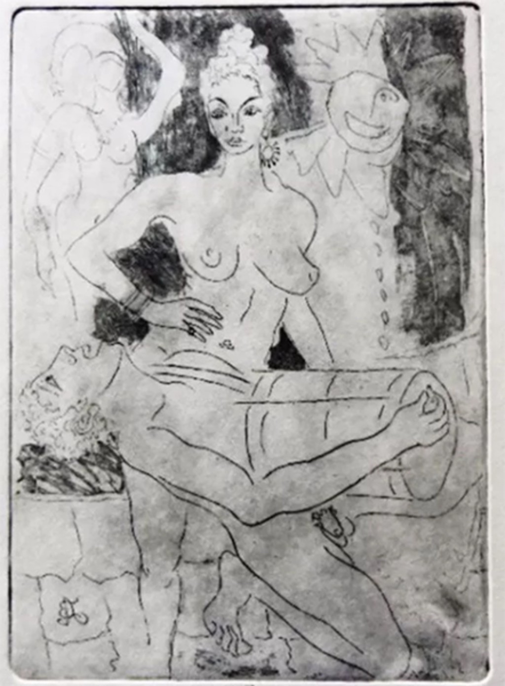 Há também composições em que a leveza das linhas substituem a força de manchas densas. Em uma dessas obras, observamos o contorno bem definido de corpos nus totalmente entregues a essa encenação carnavalesca. As posturas e semblantes nos permitem identificar a dialética estabelecida entre as personagens.