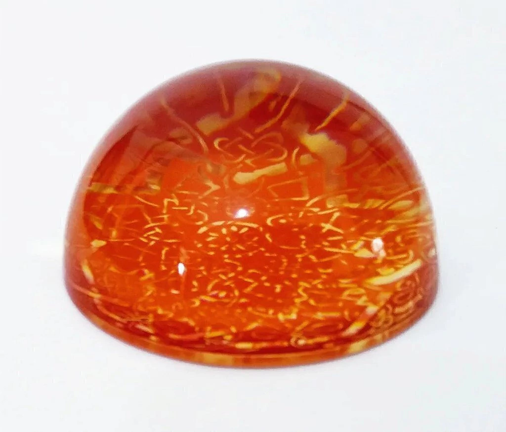 Peso de papel em resina de acrílico com desenho cinético em seu interior, da década de 1970.