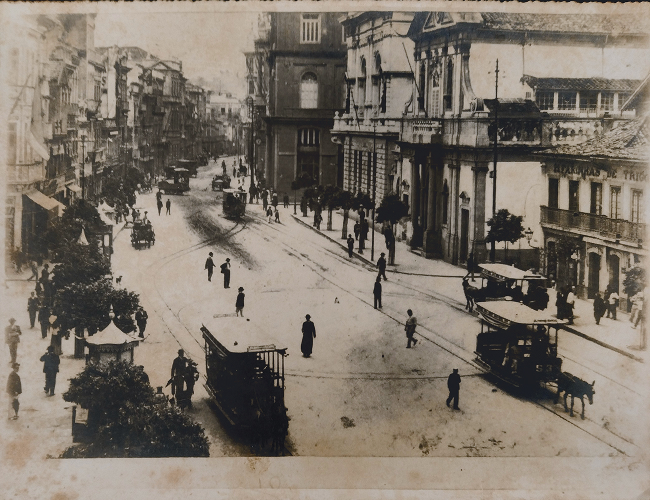 Rara imagem do Rio antigo, a cena mostra bondes puxados por animais e percebe-se a urbanização intensa. O local é a Avenida Passos, no Centro do Rio de Janeiro, uma das vias mais importantes da cidade naquela época.